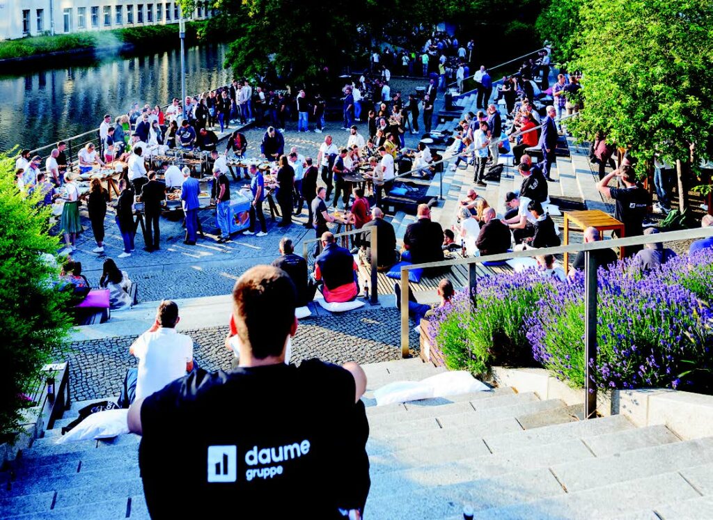 Beim Family-Style-Lunch saß man an langen Tafeln – wie auf dem Bau nach getaner Arbeit. In thematisch gestalteten Erlebnisräumen begegnete man sich auf Augenhöhe: vom Kaminzimmer mit Impulsen über den Hobbyraum bis zum Werkraum für gemeinschaftliches Tüfteln und den Bau einer gemeinsamen Kettenreaktion. Ergänzt wurde das Programm durch die Einbindung starker Partner wie Viva con Agua, eine Non-Profit-Organisation, die sich weltweit einsetzt, um Menschen für sauberes Trinkwasser zu aktivieren und dafür Spenden zu generieren. Das Programm bot dann auch emotionale Rückblicke und persönliche Geschichten aus der Unternehmerfamilie Daume.