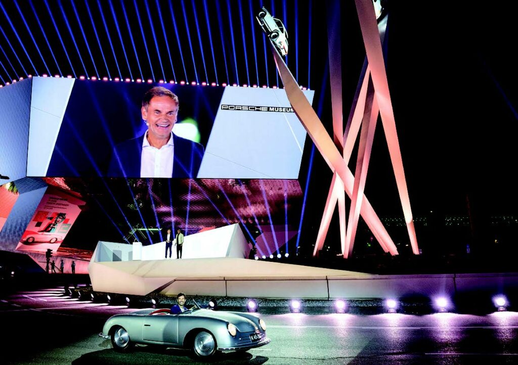 Offizielles Kick-off der Aktionen bildete ein Tag am Porsche-Kreisel. Die Eröffnung der Sonderausstellung zum Thema »75 Jahre Porsche Sportwagen« und eine dynamische 60-minütige Show bildeten ein einmaliges, eintägiges Live-Erlebnis für die 700 VIPs, Pressevertreter:innen, Markenbotschafter:innen und die versammelte Porsche-Familie. Die Show wurde in einem Public Livestream auf Porsche NewsTV, im Porsche Newsroom sowie auf YouTube und Twitch übertragen.