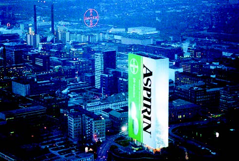 So ließ die Bayer AG ihr Verwaltungshochhaus 1999 zum 100. Geburtstag des Aspirins zur größten Pillenschachtel auf dem Planeten verkleiden.